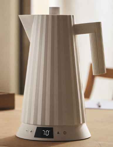 La bouilloire Plissé allie le côté fonctionnel à un design plastique fascinant : comme un tissu qu’un pliage serré transforme en un objet tridimensionnel, cette bouilloire évoque une robe de haute couture. La nouvelle version présente une possibilité de régulation de la température, ce qui élargit les possibilités d’utilisation et offre la solution idéale pour tous les cas où l’eau ne doit pas être bouillante.