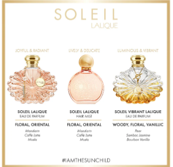 Lumineuse, chaleureuse, follement sensuelle, l’Eau de Parfum Soleil Vibrant Lalique propose une nouvelle interprétation de la collection Soleil Lalique, avec une formule entièrement inédite et enrichi d’ingrédients d’exception issus de ressources durables.