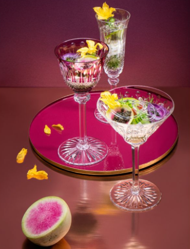 Le Roemer améthyste fait partie d'un service de table en cristal de couleur. Celui-ci se compose également d'une flûte à champagne, une chope, un gobelet cylindrique petit, un verre à cocktail et un old fashion moyen n°3.